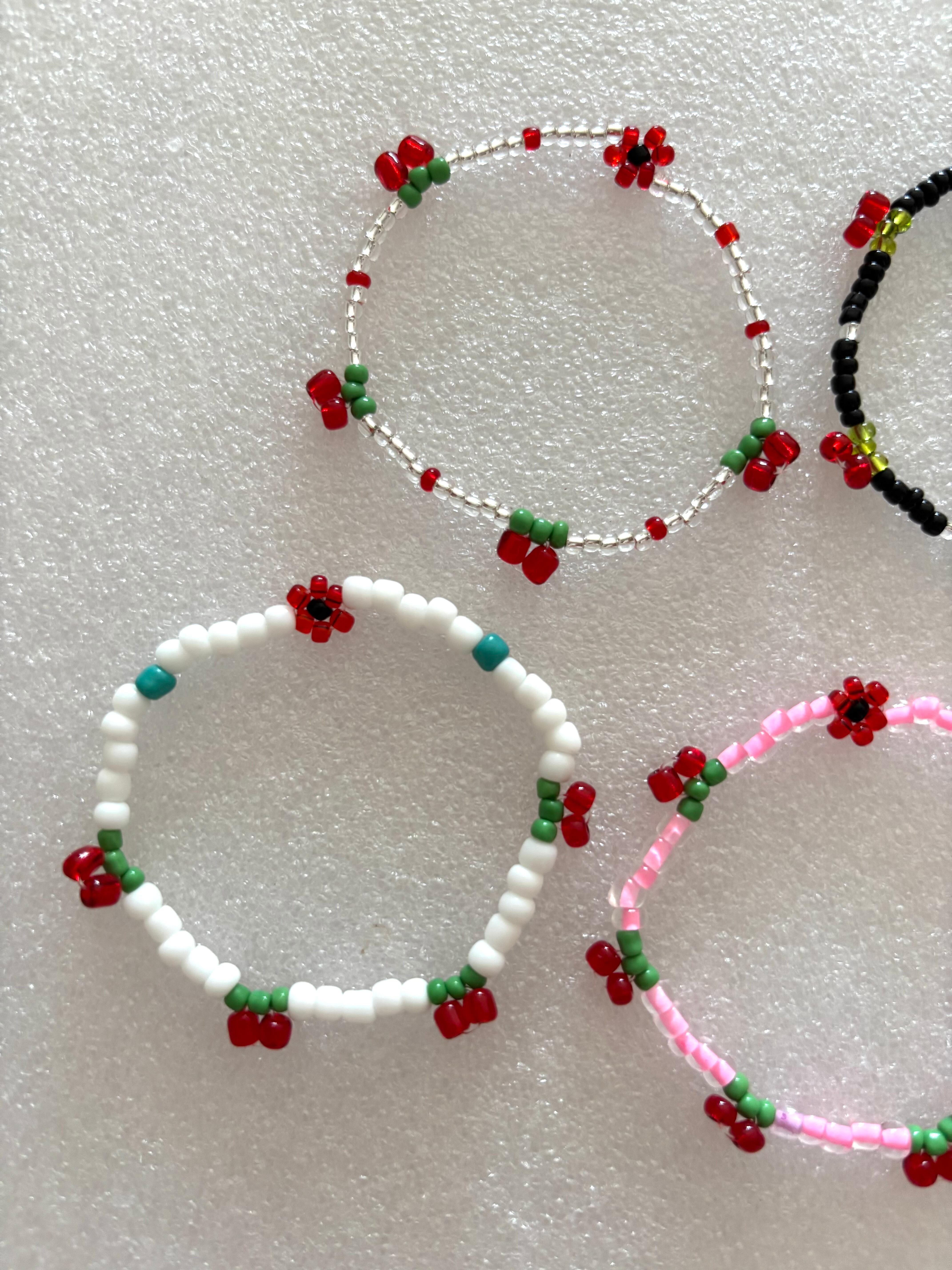 ポピーとチェリーのブレスレットです。 5色展開です。 売り上げの一部はパレスチナの支援に関する寄付に充てられます。